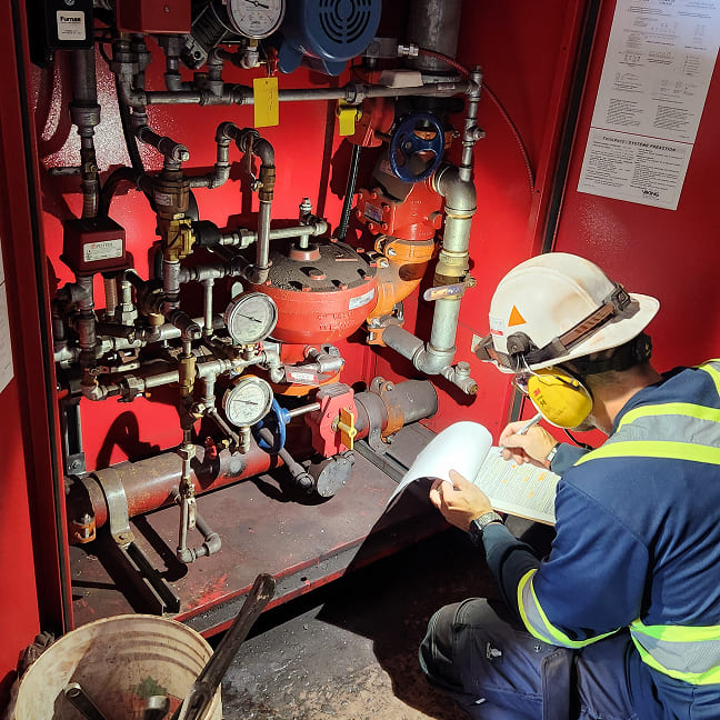 Inspection rigoureuse d’un réseau de gicleurs selon les normes en vigueur. Vérification de la pression, des composantes et de la conformité des systèmes incendie industriels.